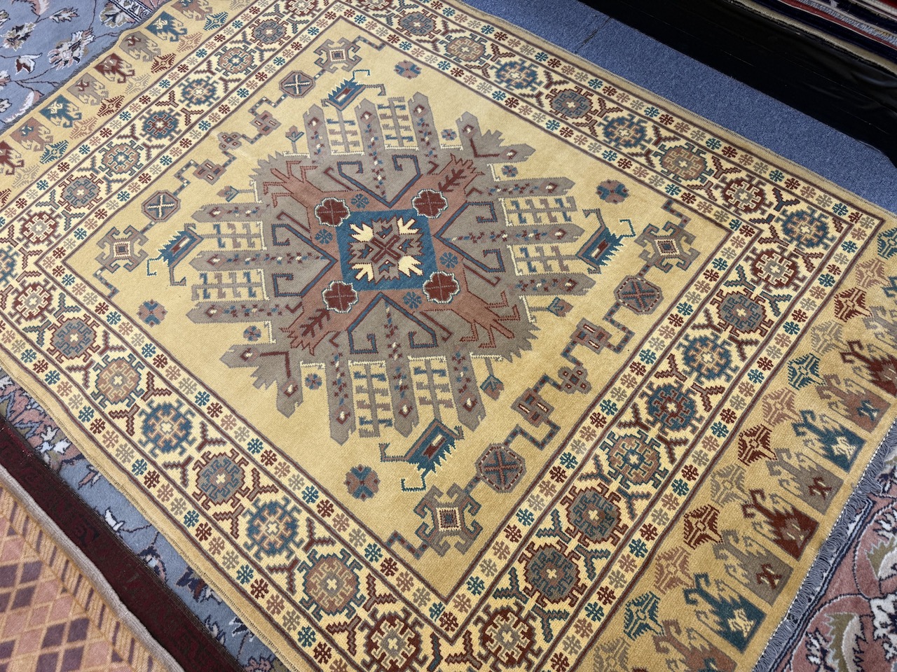 Afghan carpets are known for their rich use of tribal motifs, each carrying symbolic meanings and stories. These motifs often draw inspiration from the natural world, daily life, and spiritual beliefs of the weaver’s community. In the context of the Star Kazakh design, the incorporation of tribal motifs adds a unique, personal touch to the otherwise geometric and symmetrical patterns.