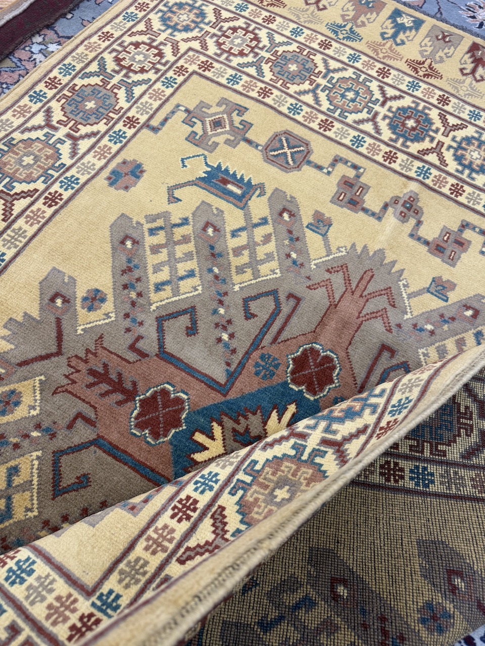 Surrounding the central medallion is a beautiful border, which frames the entire carpet. The border is usually composed of multiple layers, each adorned with tribal motifs that reflect the weaver’s cultural heritage and artistic flair. These motifs can include stylized animals, flowers, and abstract shapes, contributing to the carpet’s overall harmony and balance.
