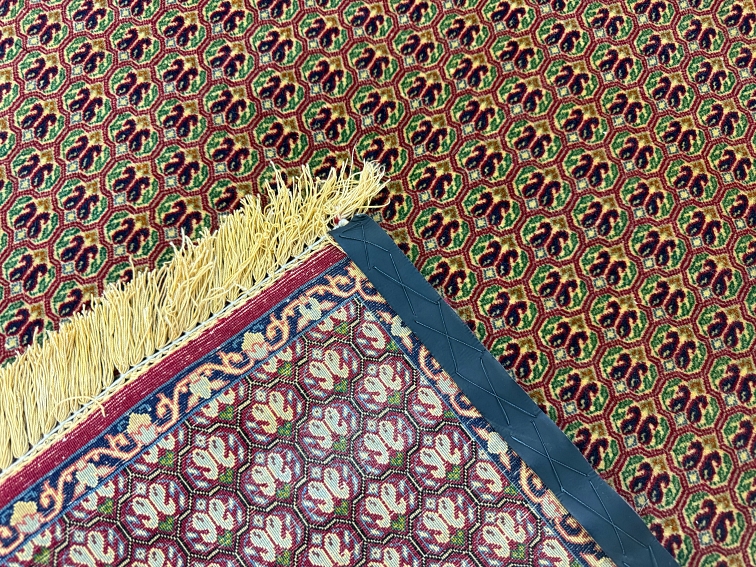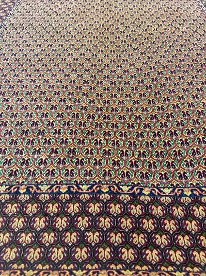 Inspired by the Persian Tabriz Mahee style, the design of this rug features a repeat paisley motif, known as “Boteh” in Farsi, which adds a sense of elegance and sophistication to its overall aesthetic. Each paisley motif is meticulously woven into the silk base of the rug, creating a mesmerizing pattern that captures the imagination and evokes the rich cultural heritage of Iran.