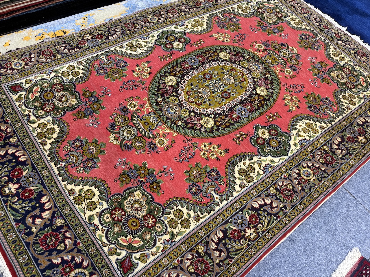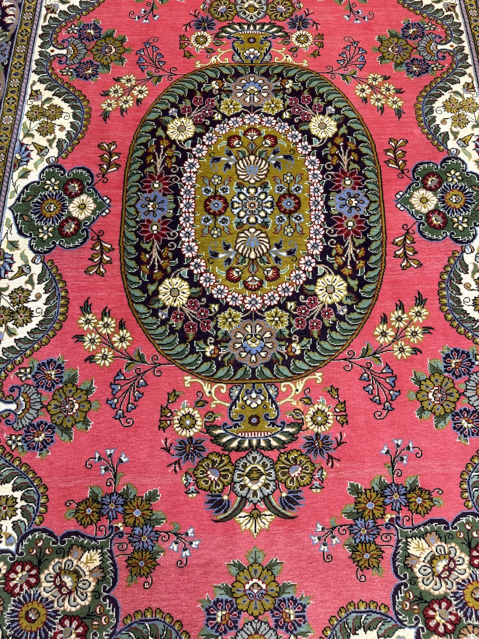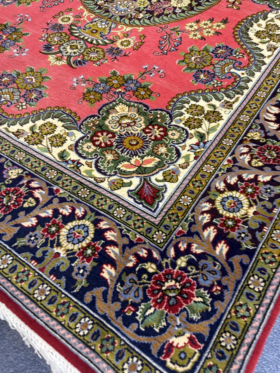 Woven on a cotton base, this rug has a luxurious feel and a sturdy construction that belies its age. Despite being woven two decades ago, it has never been used, giving it the appearance of being brand new. This pristine condition only adds to its allure, making it not just a rug but a cherished heirloom to be treasured for a lifetime.