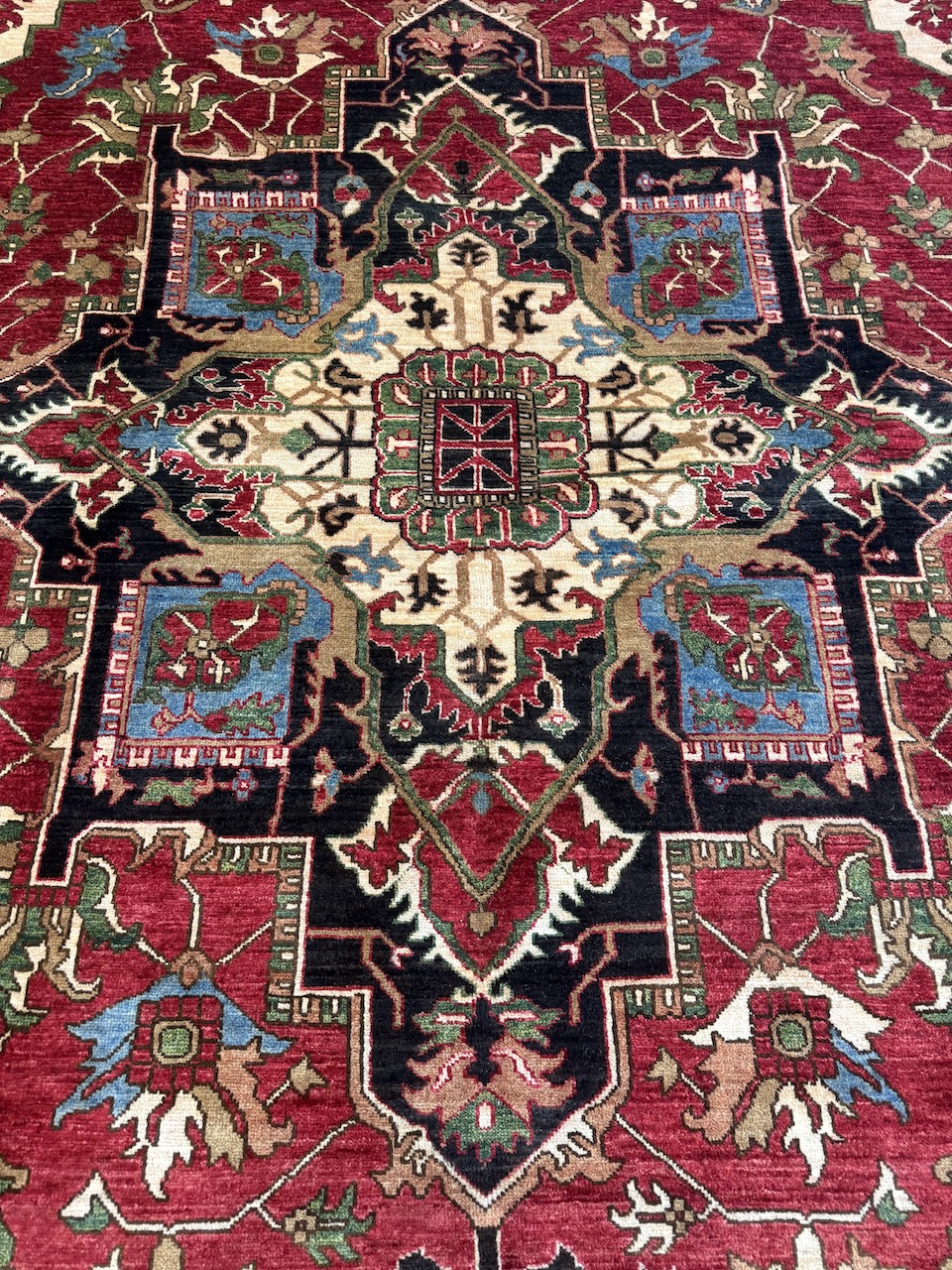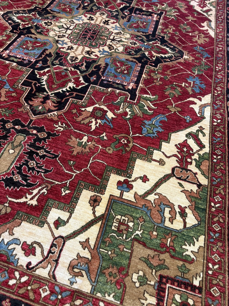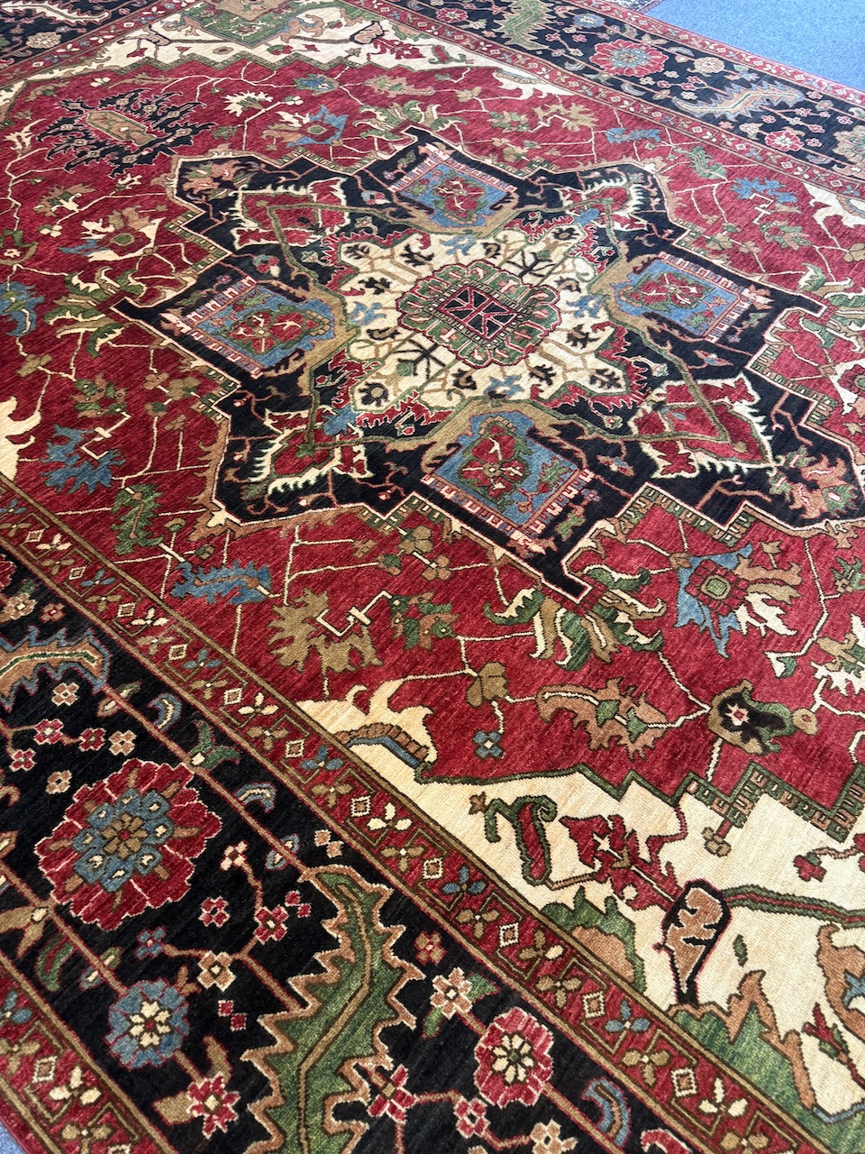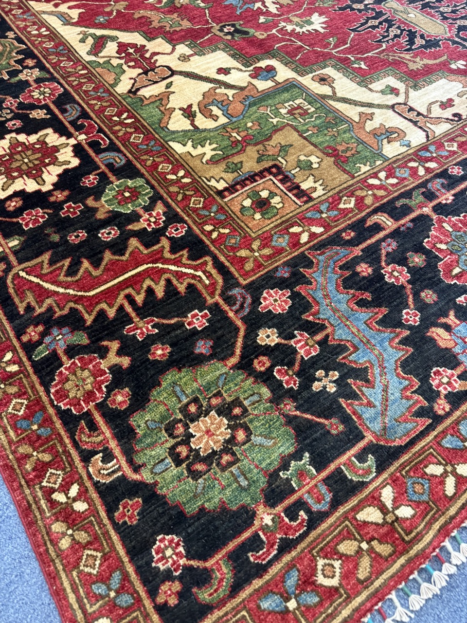 The design features the geometric antique Serapi motif, which is complemented by a striking central medallion that resonates with the patterns traditionally found in Persian Heriz rugs. This combination not only reflects a deep appreciation of historical artistry but also brings a contemporary elegance to the piece. The multicolored border motifs are infused with tribal elements, adding layers of depth and visual storytelling that invite admiration and intrigue.